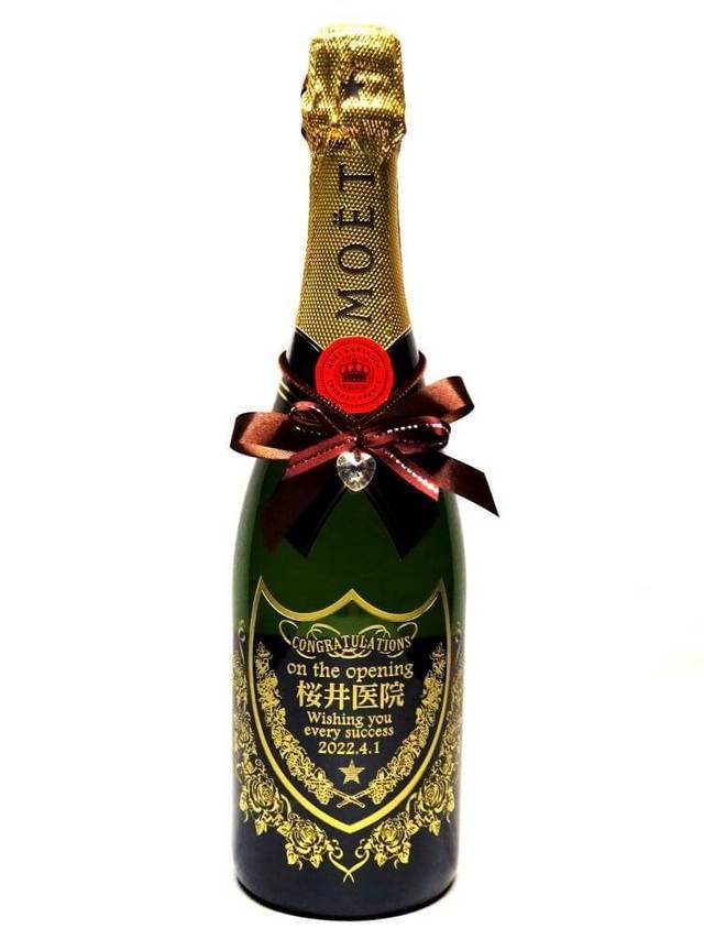 名入れシャンパンで開店お祝い。ロゴを入れることもできます。印象に残るプレゼントです。